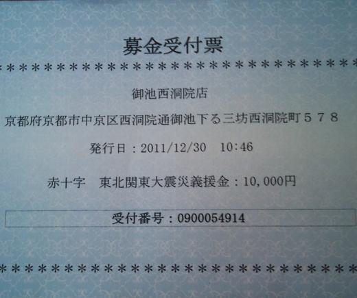 被災地への義援金として、12月のレッスン参加者数100名×100円=10,000円を日本赤十字社に募金いたしました。