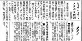 主な内容はこのようです。世田谷区でユニークなメタボリック症候群対策が始まる。世田谷区週末早朝ダンスコミュニティが来年1月~3月まで世田谷区在住、在勤男性を対象に若者に人気の音楽「ヒップホップ」を使ったエクササイズを指導する。題して「OYAJI(オヤジ)改造計画」。初心者でも踊りやすく、有酸素運動の効果が高いといわれるヒップホップをプロのダンサーに教わりながら体を動かす。